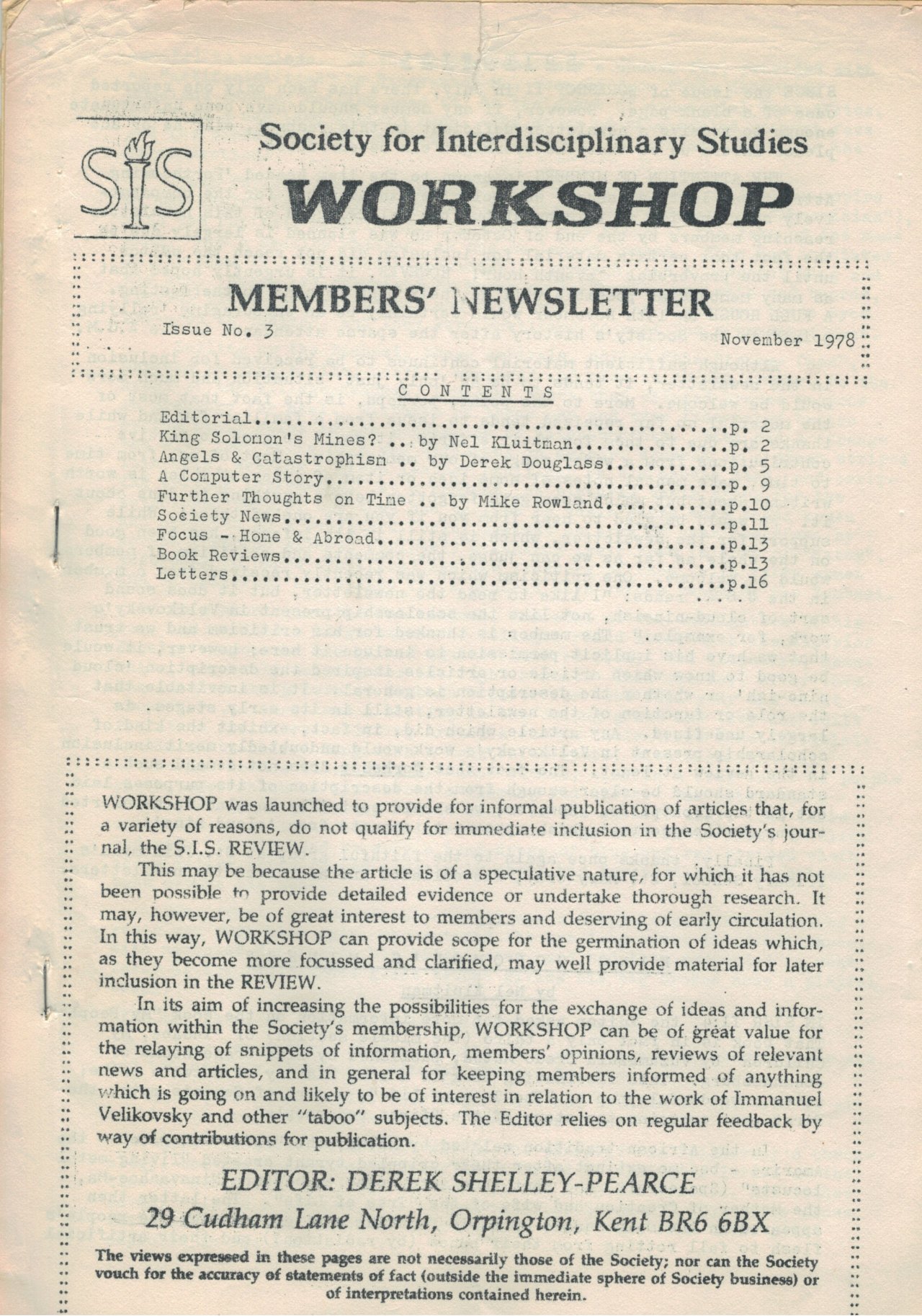 In its aim of increasing the possibilities for the exchange of ideas and information within the Society’s membership, WORKSHOP can be of great value for the relaying of snippets of information, members’ opinions, reviews of relevant news and articles, and in general for keeping members informed of anything which is going on and likely to be of interest in relation to the work of Immanuel Velikovsky and other “taboo” subjects. The Editor relies on regular feedback by way of contributions for publication.