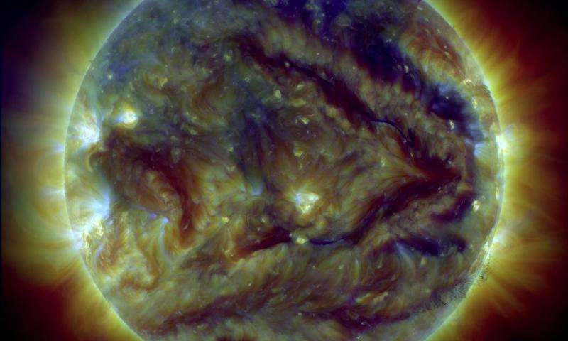 at http://phys.org/print352105901.html … we have an image of giant filaments on the face of the Sun. Filaments are said to be cooler clouds of solar material suspended above the Sun's surface by powerful magnetic forces. Filaments can float for days without altering a great deal. They can erupt, releasing material that then rains back down on the surface of the Sun – or is blasted into space. It then becomes a moving cloud of plasma, a coronal mass ejection event (CME).