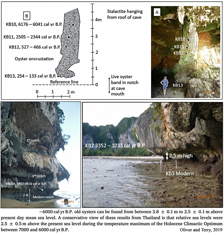This information is derived from a study, Oliver and Terry 2019, published in Palaeogeography, Palaeoclimatology and Palaeoecology (see http://notrickszone.com/2019/02/07/oyster-evidence-affirm-sea-levels-wer… … ). Basically, oyster evidence affirm that sea levels were up to 3.8m higher (in Thailand) 6000 years ago (roughly around 4000BC).